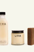 This three-step set delivers head-to-toe glow, neatly packed in our yellow LIHA branded travel bag. Begin with Ose Gidi Black Soap to deeply cleanse and exfoliate, follow with Idan Oil to nourish and scent the skin, and finish with Ivory Shea Butter to lock in all that moisture.